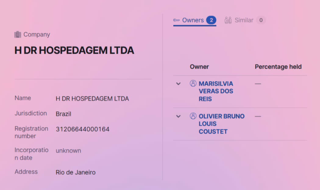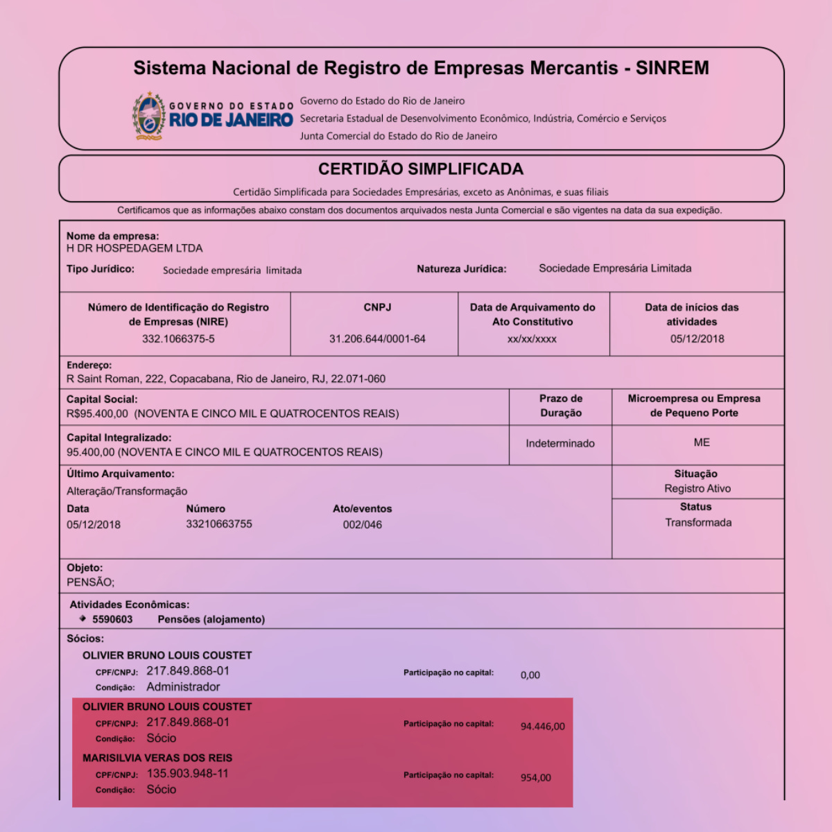Certidão Simplificada de HDR Hospedagem Ltda (CNPJ 31.206.644/0001-64), JUCERJA, 15 mai 2024. Sócios : Olivier Bruno Louis Coustet (99%), Marisilvia Veras Dos Reis (1%)