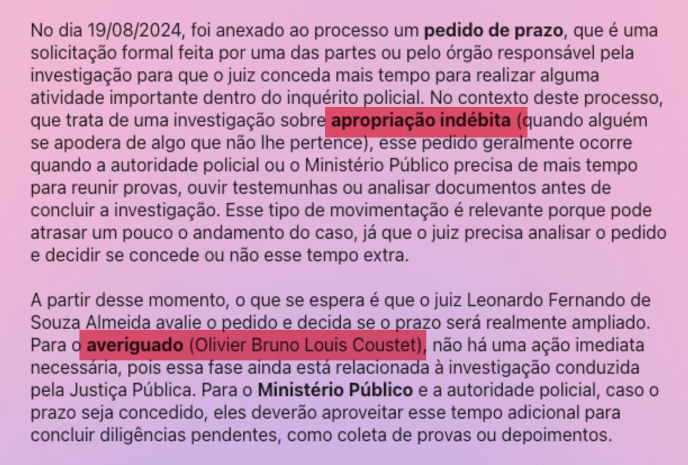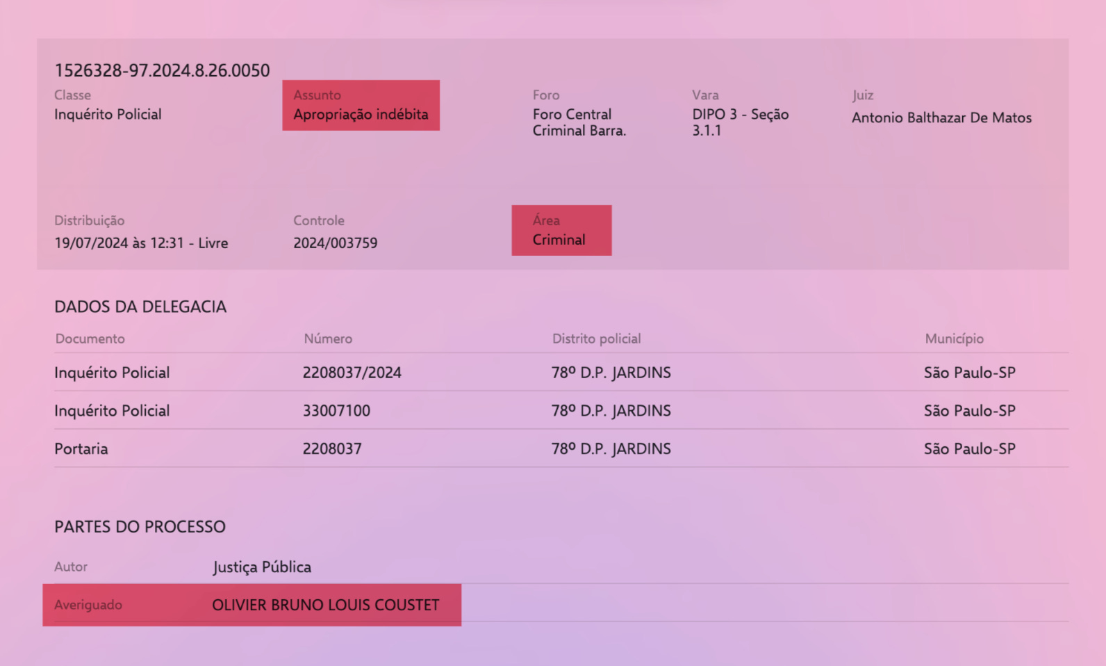 Enfin, et surtout, depuis juillet 2024, une enquête de police pour apropriação indébita (détournement) est ouverte contre Coustet au commissariat des Jardins, à São Paulo44. Le Parquet suit le dossier. La police demande régulièrement des délais supplémentaires. Au moment où nous publions, l’enquête est toujours en cours.