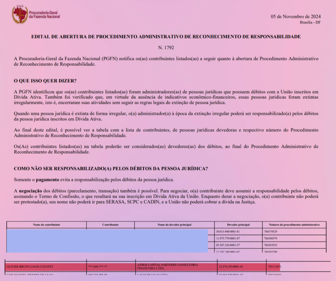 « Edital de Abertura de Procedimento Administrativo de Reconhecimento de Responsabilidade », n° 1792, Brasília, 5 novembre 2024. Contribuinte : OLIVIER BRUNO LOUIS COUSTET. Devedor principal : Athos Capital Partners Consultoria Financeira Ltda, CNPJ 13.574.593/0001-41. Numéro du procedimento administrativo : 78511.5071. La PGFN identifie Coustet comme administrateur d’une personne morale inscrite en dette active de l’Union (Dívida Ativa da União) et dissoute irrégulièrement (extinta irregularmente), c’est-à-dire sans suivre les règles légales d’extinction. En vertu de la législation brésilienne, l’administrateur à l’époque de la dissolution irrégulière peut être tenu personnellement responsable des dettes fiscales fédérales de la société.