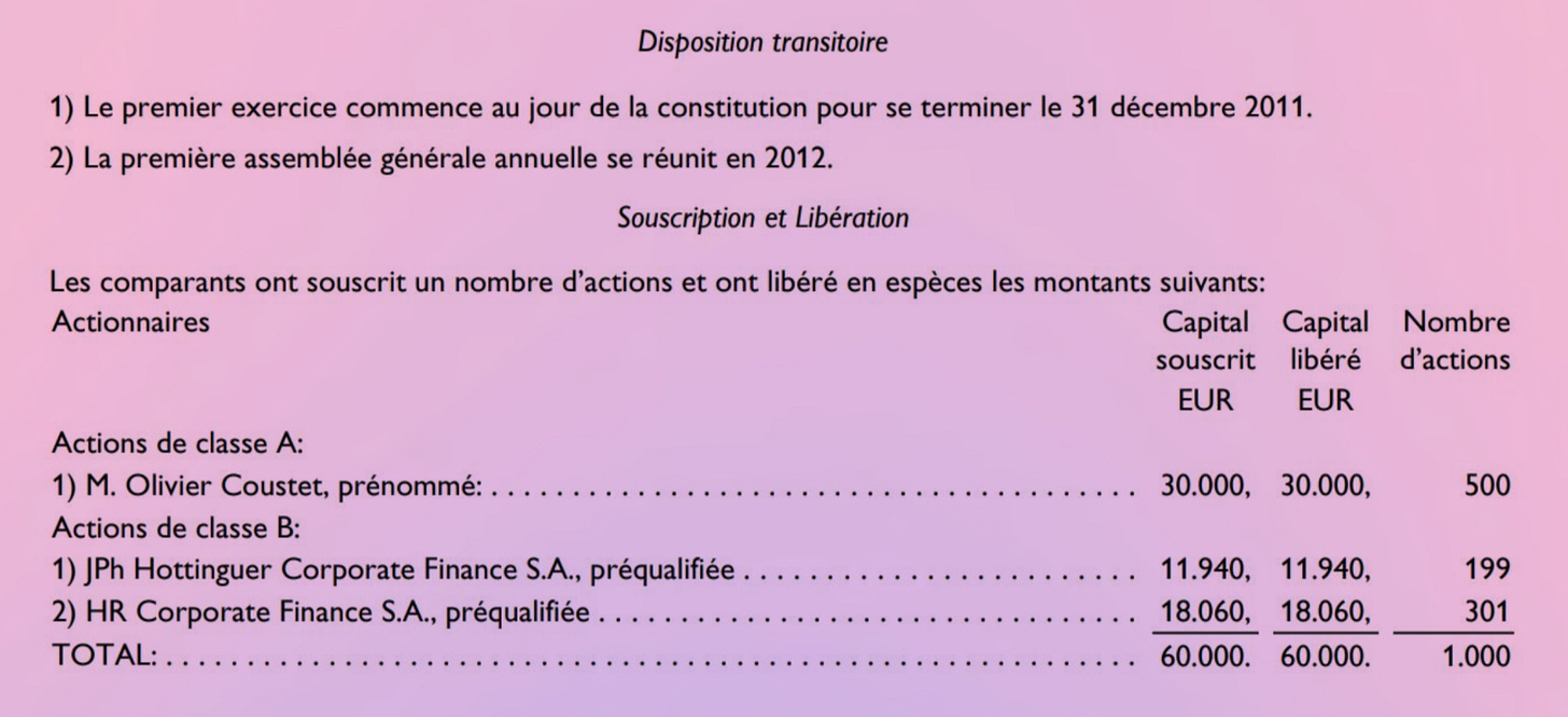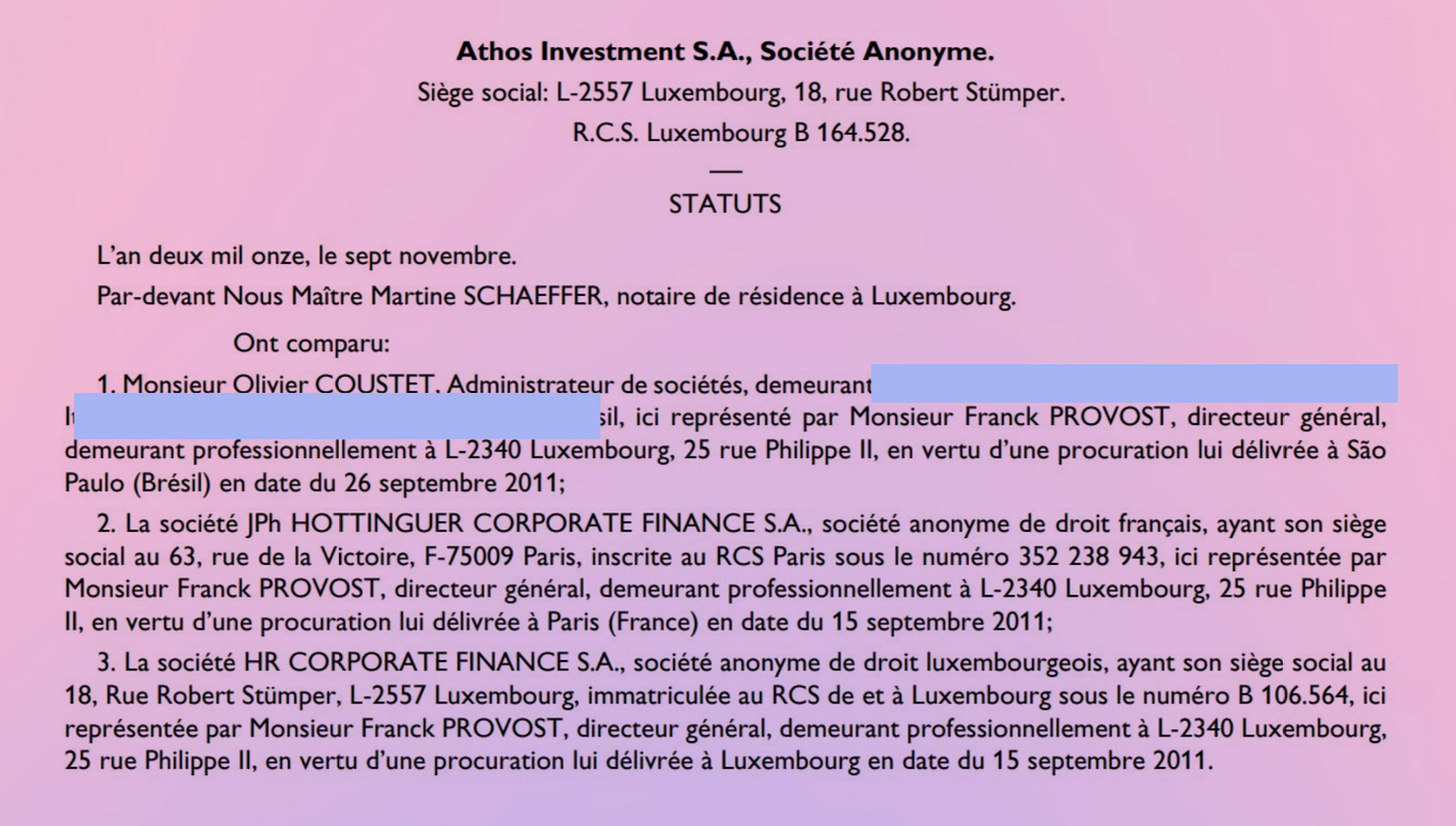 Extrait des statuts d’Athos Investment au Luxembourg, qui détient Athos Finance