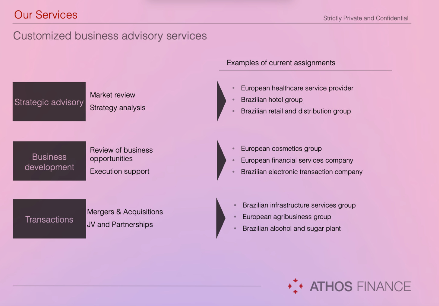 Athos Finance est fondée en 2006, basée à São Paulo, officiellement spécialisée dans le conseil en « corporate finance cross-border ». Coustet la rejoint en février 2011 comme associé gérant18 et y restera trois ans, jusqu’en 2014. Dans ses plaquettes, Athos se présente comme un hub transcontinental, « spécialisé dans les enjeux stratégiques cross border ». Expression toujours pratique pour ne rien dire tout en donnant l’impression de tout couvrir. La JV avec Hottinguer est présentée comme une « structural alliance » 50/50, presque un sceau de respectabilité patrimoniale franco-suisse. La plaquette martèle : la maison Hottinguer est « independent », héritière d’un « long standing heritage » de banquiers familiaux. L’ancien monde veille.