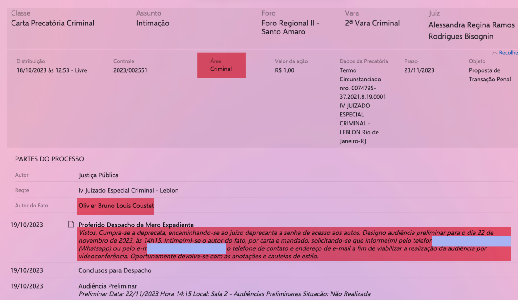 Commission rogatoire criminelle nº 1042311-33.2023.8.26.0050, Vara do Juizado Especial Criminal, Foro Central Criminal Barra Funda, tribunal de justice de l'État de São Paulo. Origine : IV Juizado Especial Criminal du Leblon (Rio de Janeiro). Mandat d'intimation exécuté le 9 novembre 2023 à l'adresse Rua Tabapuã 422, conj. 51, Itaim Bibi, São Paulo (Edifício Reseda Office).