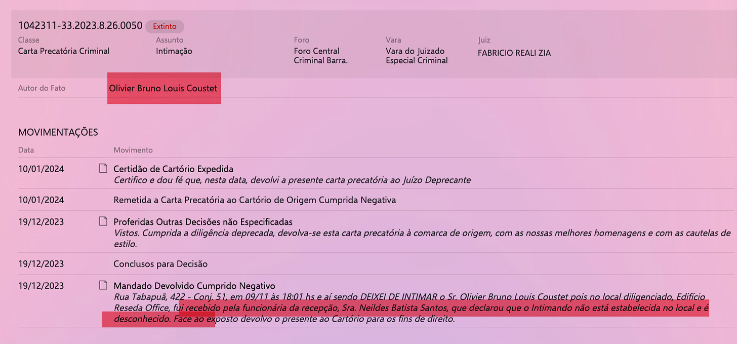 Fin 2023, le tribunal pénal spécial du Leblon, à Rio, cherche à le convoquer45. Il envoie une commission rogatoire à São Paulo46. En novembre, un huissier se rend Rua Tabapuã, dans le quartier d’affaires de l’Itaim Bibi, à l’adresse d’un immeuble de bureaux :