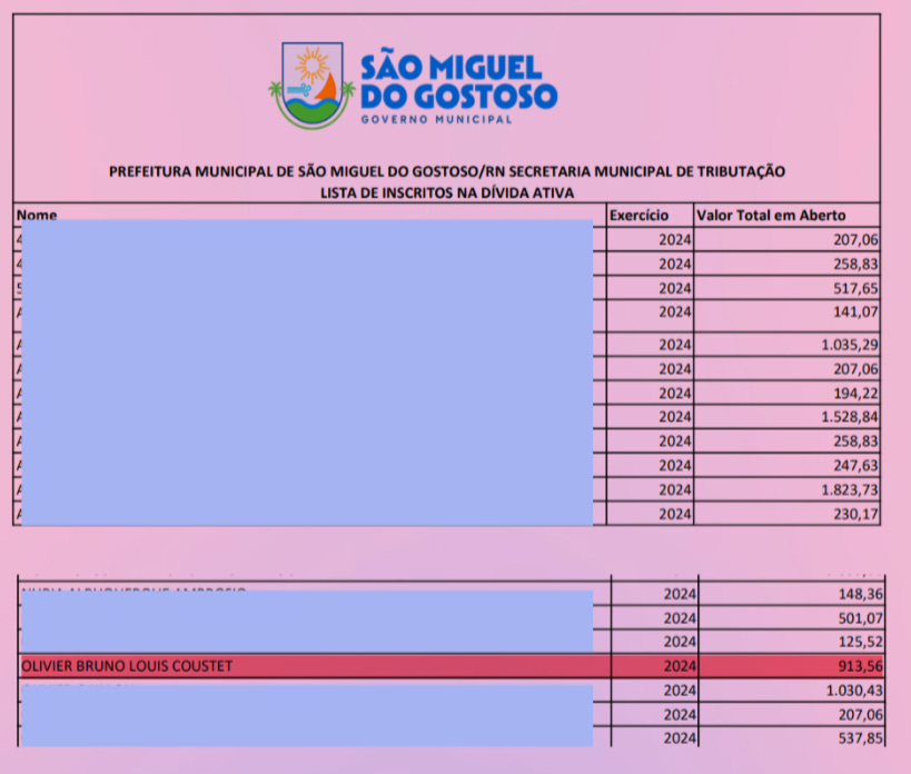 Dès 2012, un propriétaire carioca l’assigne pour loyers impayés. Coustet conteste, fait appel. Il perd39. En 2024, son nom figure sur la liste des inscrits en dette active (dívida ativa) de la mairie de São Miguel do Gostoso, une station balnéaire du Rio Grande do Norte : 913,56 BRL d’impôts municipaux impayés40. Ce qui révèle au passage l’existence d’un bien immobilier supplémentaire, dans le Nordeste cette fois. Une dette fiscale municipale a aussi été identifiée à Cotia, dans la banlieue de São Paulo, avant d’être réglée41.