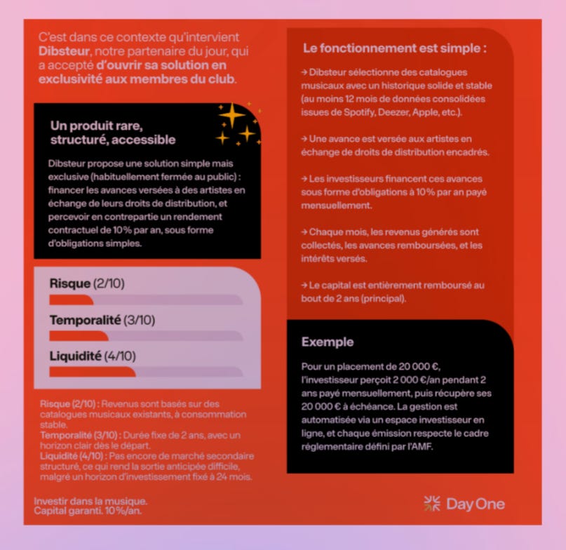 Plus étonnant, le drop suivant propose du 10% / an avec capital garanti pour investir… dans la musique via Dibsteur. Et qui pose quelques questions.