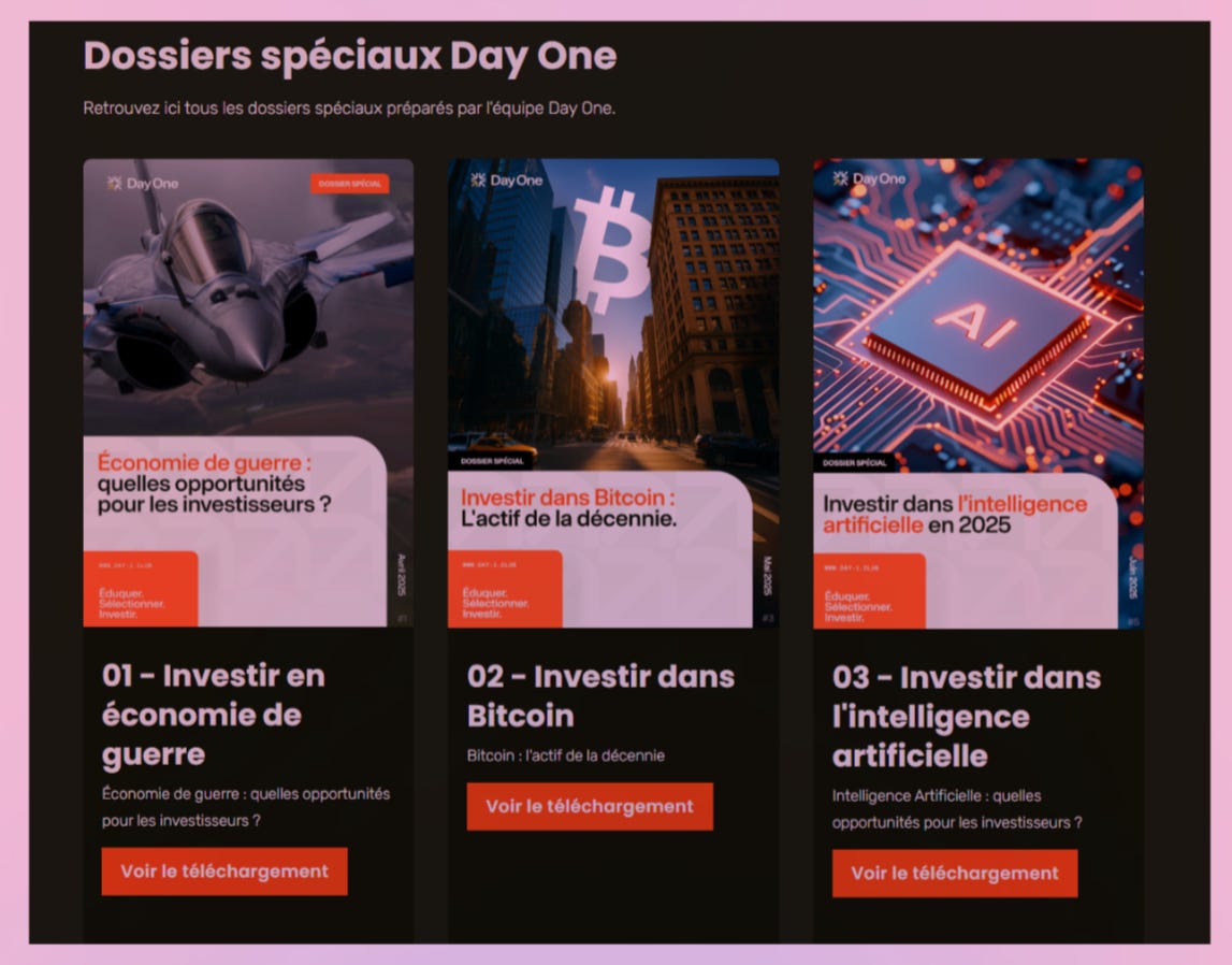 Ces alternatives sont notamment présentées par les dossiers, l’autre grande rubrique de Day One. De très longs PDF de plusieurs dizaines de pages, plutôt jolis et intéressants, qui présentent des manières d’investir sur des thématiques, comme l’IA, les forêts, les terres rares ou encore l’activité de marchand de biens.