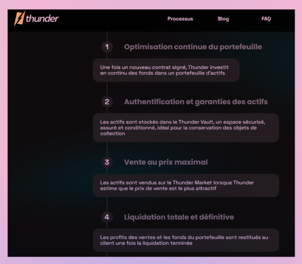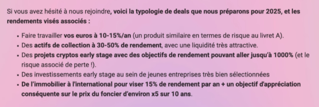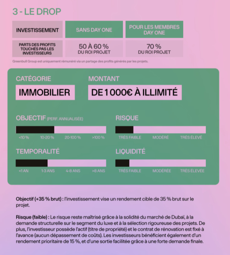 « Chaque mois, un “drop” met en lumière une classe d’actifs : un dossier complet est fourni pour expliquer son fonctionnement, ses opportunités et ses risques. Un partenaire qualifié est ensuite présenté aux membres souhaitant investir, avec des conditions préférentielles négociées (notamment des frais drastiquement réduits). »