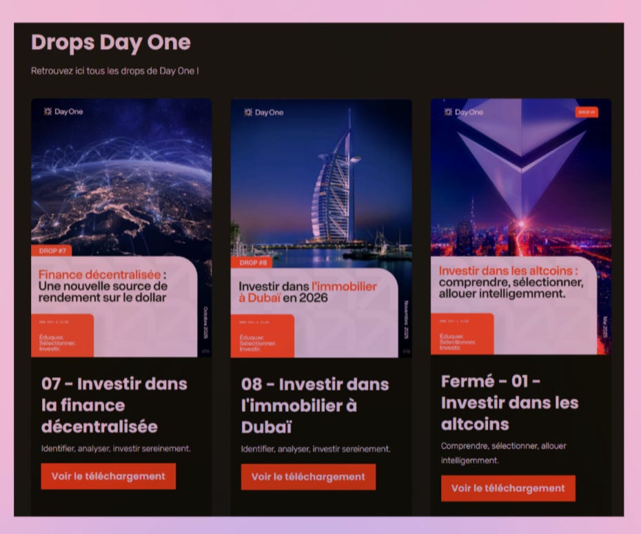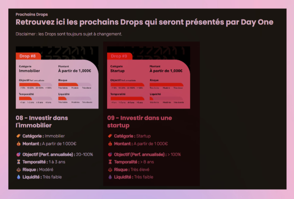 Alors, pourquoi en faire une catégorie dédiée ? Eh bien la réponse est planquée à la fin des PDF : les drops ont en réalité des dossiers qui servent à vendre un placement financier. Ce que Day One m’explique avec ses mots. Et son angle.