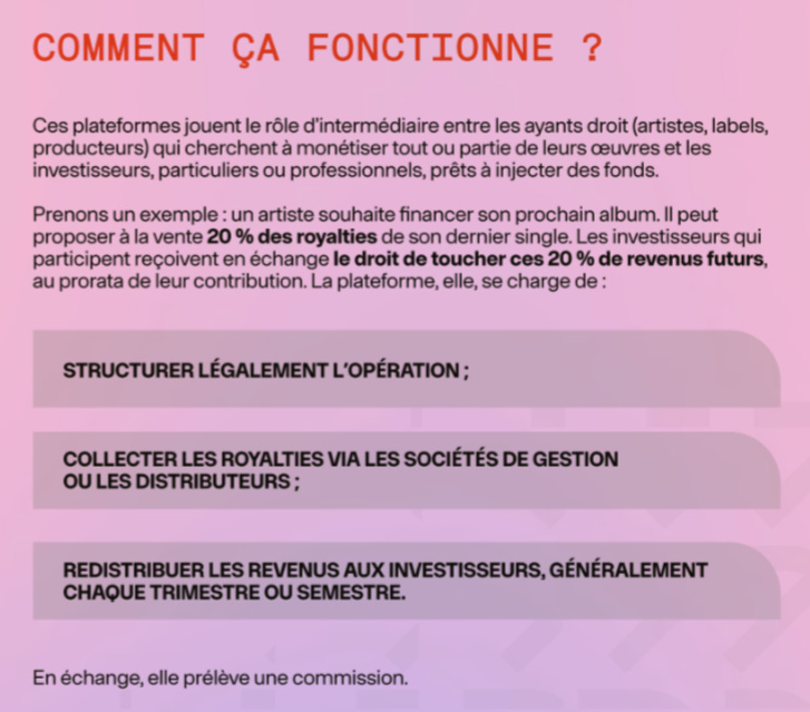 La présentation, elle, raconte plutôt l’histoire habituelle : comment la musique et les droits d’auteurs génèrent de l’argent. Parce qu’il est bien question ici d’« investir dans des chansons ». Et qui dans la formulation ressemble à ANote ou Bolero, qui sont d’ailleurs cités.