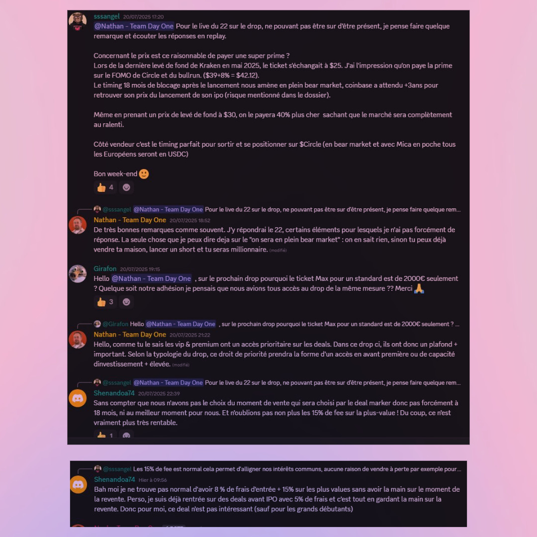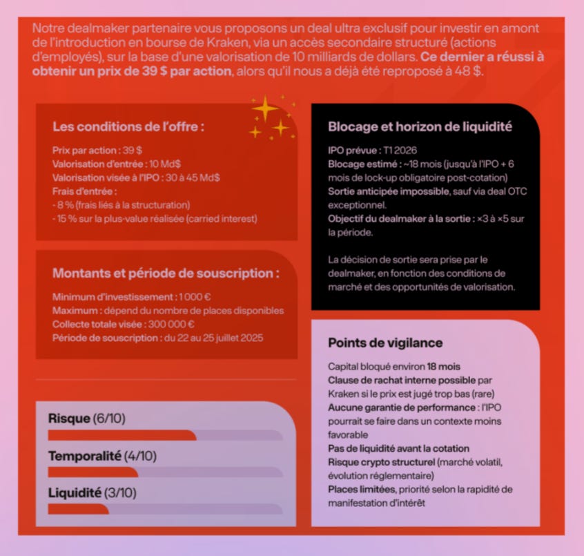 Puis arrive la possibilité d’investir dans le pré-IPO de Kraken pour 39$ l’action à 10G$ de valorisation, à partir de 1’000€. Des conditions, datées de l’été 2025, effectivement avantageuses, puisqu’en novembre dernier, Citadel Securities est apparu à la captable de Kraken lors d’un tour à 800M$ pour 20G$ de valo. Mais qui ne dit, en réalité, pas grand-chose des conditions d’entrée réelles des membres de Day One, tellement les pactes d’associés et les SPV intermédiaires sont complexes et nombreux. Mais qui pose néanmoins la question de l’intermédiaire qui structure ces 300k€ levés, contre 8% de frais upfront et 15% de carried, puisque Day One n’a aucun agrément. Et qui ressemble à ces deals qu’on avait vus sur le club d’Hakim Benotmane, qui financent le plus souvent la liquidité de gros véhicules.