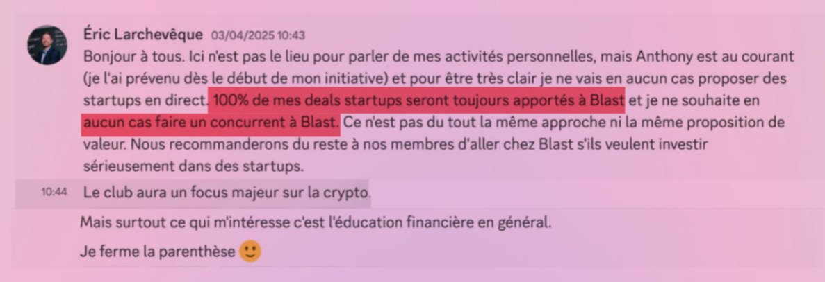 « Je vais lancer un club autour de l’éducation financière qui va parler d’investissement […] L’activité n’a rien à voir avec Blast, mais il n’est pas impossible que l’on puisse désigner ce club par “club d’investissement” (même si aucun investissement n’est proposé). »