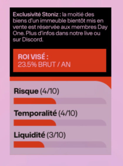 Dans le 2e drop, il est question de placer à 23,5% / an pour de l’immobilier à Marrakech via Stoniz. Une société française créée il y a tout juste un an par Jonathan Nabais, dont ce n’est visiblement pas l’activité principale, et qui était à l’origine censée être une énième plateforme de fractionnement immo. Sur son site, la plateforme revendique « 35 projets livrés » en « 15 mois d’activité », ce qui semble peu cohérent. Et n’a donc pas le moindre agrément. Ce qui n’empêche visiblement pas Day One de trouver le risque plutôt faible.