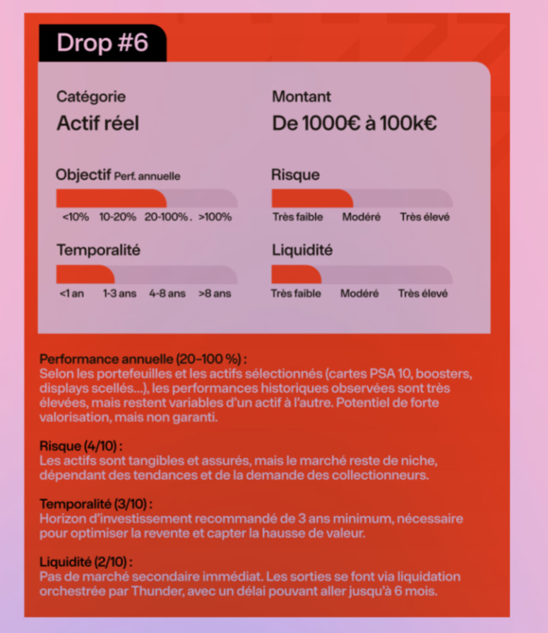 Encore plus exotique, le drop suivant propose… un investissement en cartes Pokémon. Et ici on affiche carrément du 48% / an pour un SPV qui va visiblement investir dans un portefeuille de cartes, géré par Thunder5.