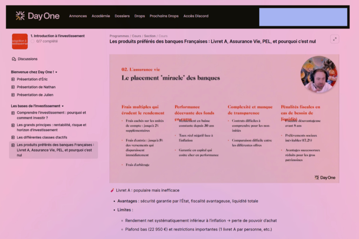 Certes, le club a une académie qui propose des formations vidéos. Mais en réalité, sur les 8 cours, le premier est une intro sans intérêt, le dernier ne sont que les lives de Day One.