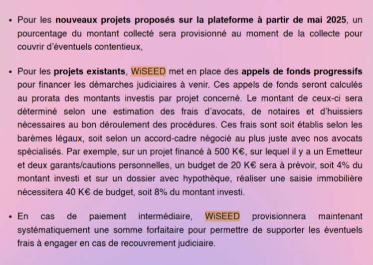 « Historiquement, WiSEED prenait en charge les frais de procédure (avocats, auxiliaires de justice, frais de saisie immobiliÚre) et se remboursait sur les sommes recouvrées. Cette approche était envisageable lorsque les cas restaient exceptionnels.»