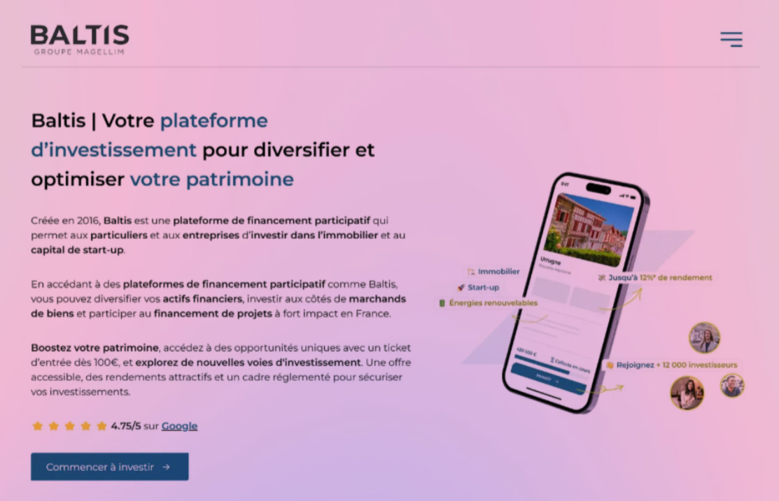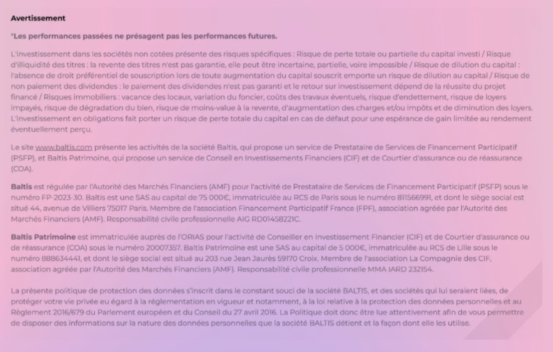 Baltis parle de rendement de 12%, parle de âsĂ©curiserâ, plus bas de ârendement attractifâ, et affiche mĂȘme un ârendement moyen de 10,7%â puis â0% de taux de dĂ©fautâ sans jamais mentionner les risques. Comme beaucoup dâautres, il faut aller touuuuut en bas de la page dans le footer pour lire des lignes imbitables que personne le lira jamais.