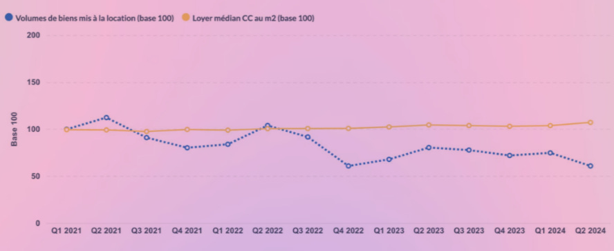 Évolution du volume trimestriel à la location et du loyer médian charges comprises, en base 100, au niveau national