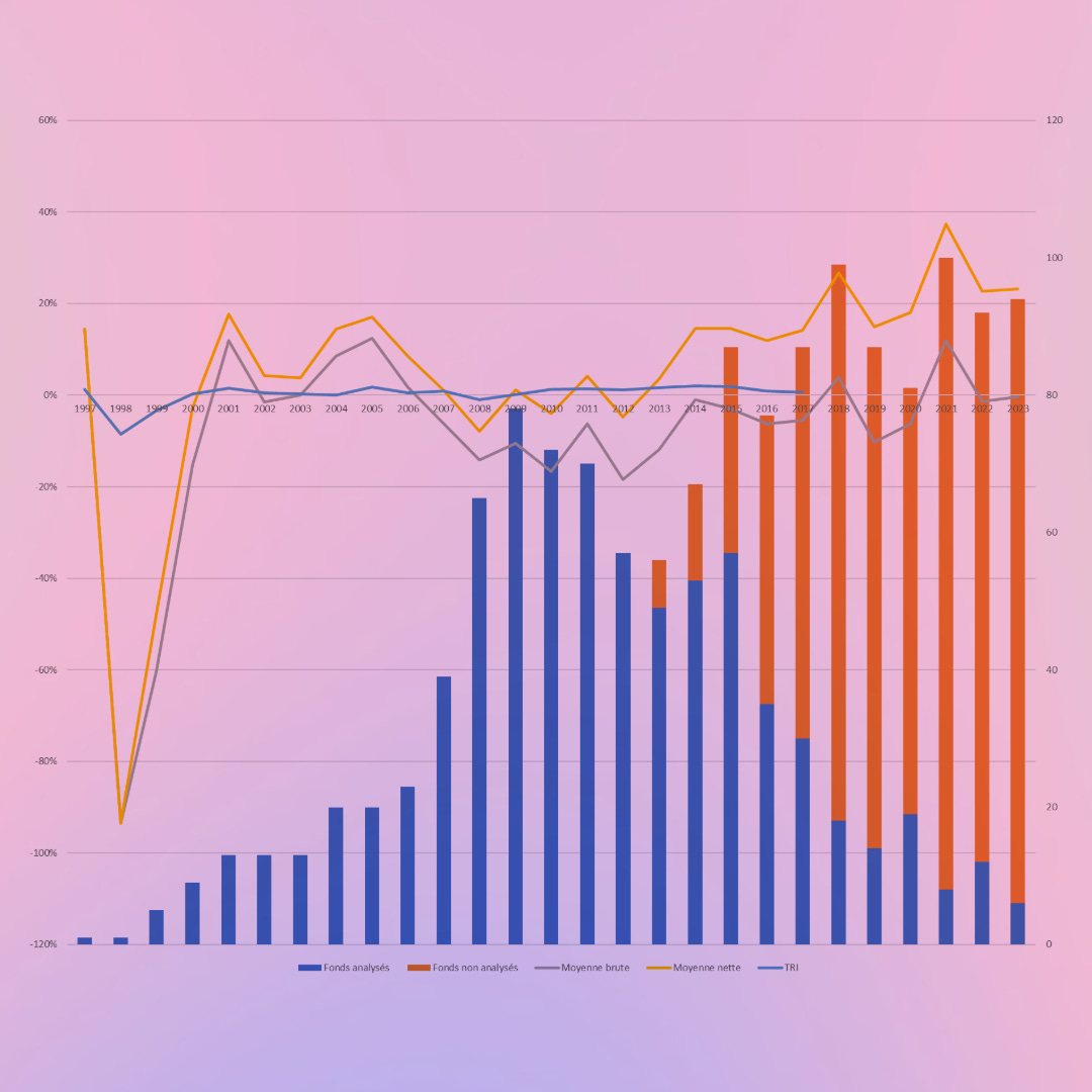 Sur plus de 2â000 fonds, jâai pu en retracer plus de 80014, liquidĂ©s ou fermĂ©s Ă la collecte, et analyser leurs performances en sĂ©parant :
