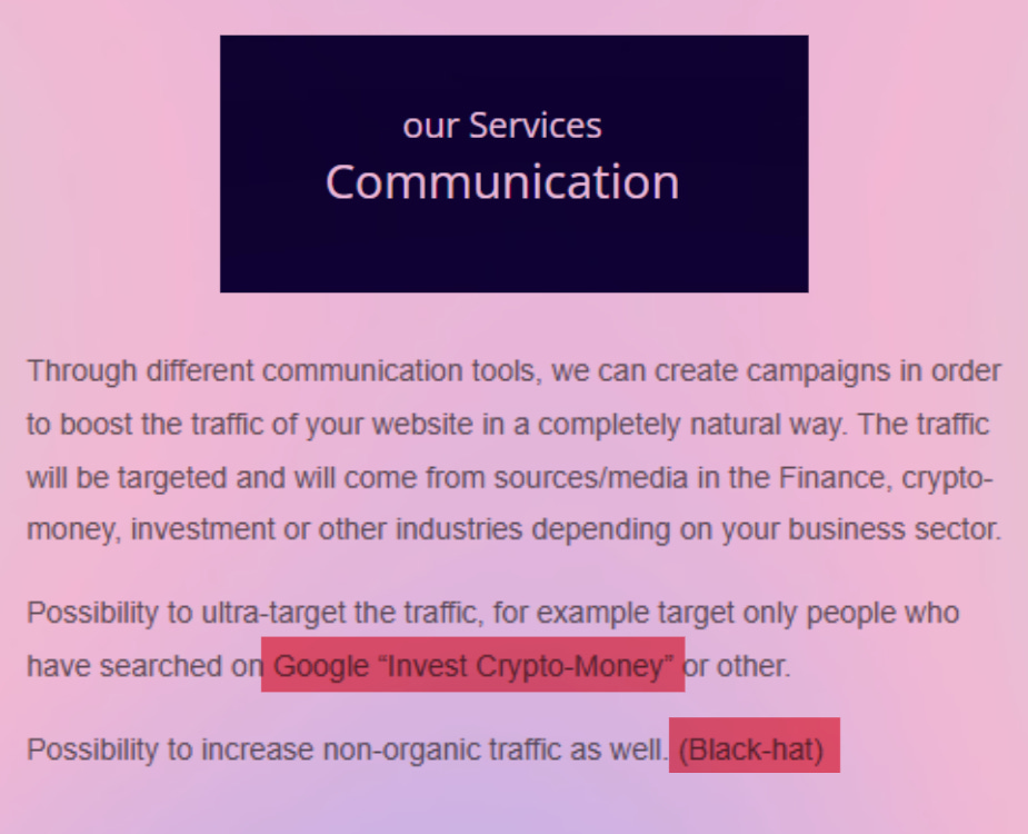Pour distribuer le token, Galeon fait appel à Markchain, une agence française spécialisée dans le marketing d’ICO fondée par Quentin Herbrecht. Le dispositif est classique : campagnes d’influenceurs YouTube, « guerrilla marketing », gestion de communautés Telegram en 15 langues, boost de réseaux sociaux. Sur sa propre page de services, Markchain proposait aussi du trafic « non-organic (Black-hat) », c’est-à-dire des techniques qui violent délibérément les conditions d’utilisation des plateformes, et vantait sa capacité à « contourner » les restrictions publicitaires de Google et Facebook sur la crypto25. La mention a depuis été retirée du site.
