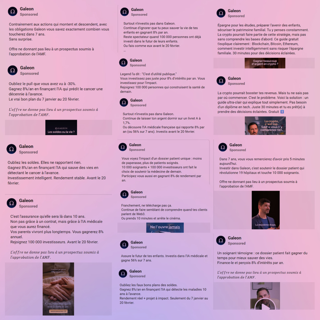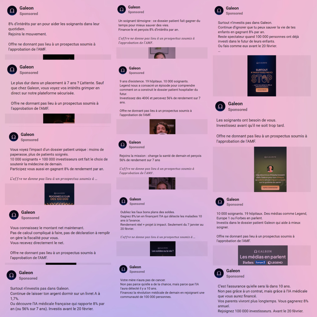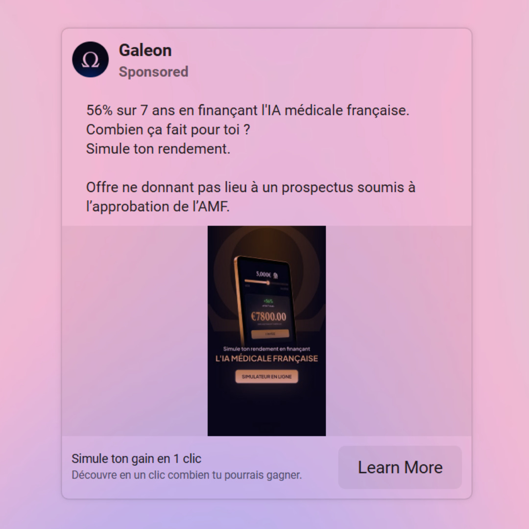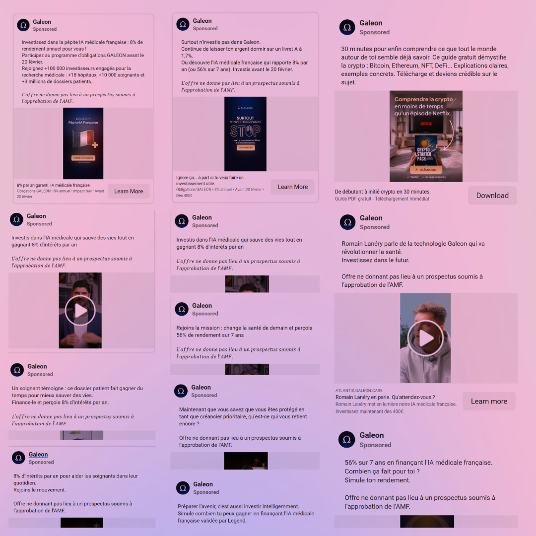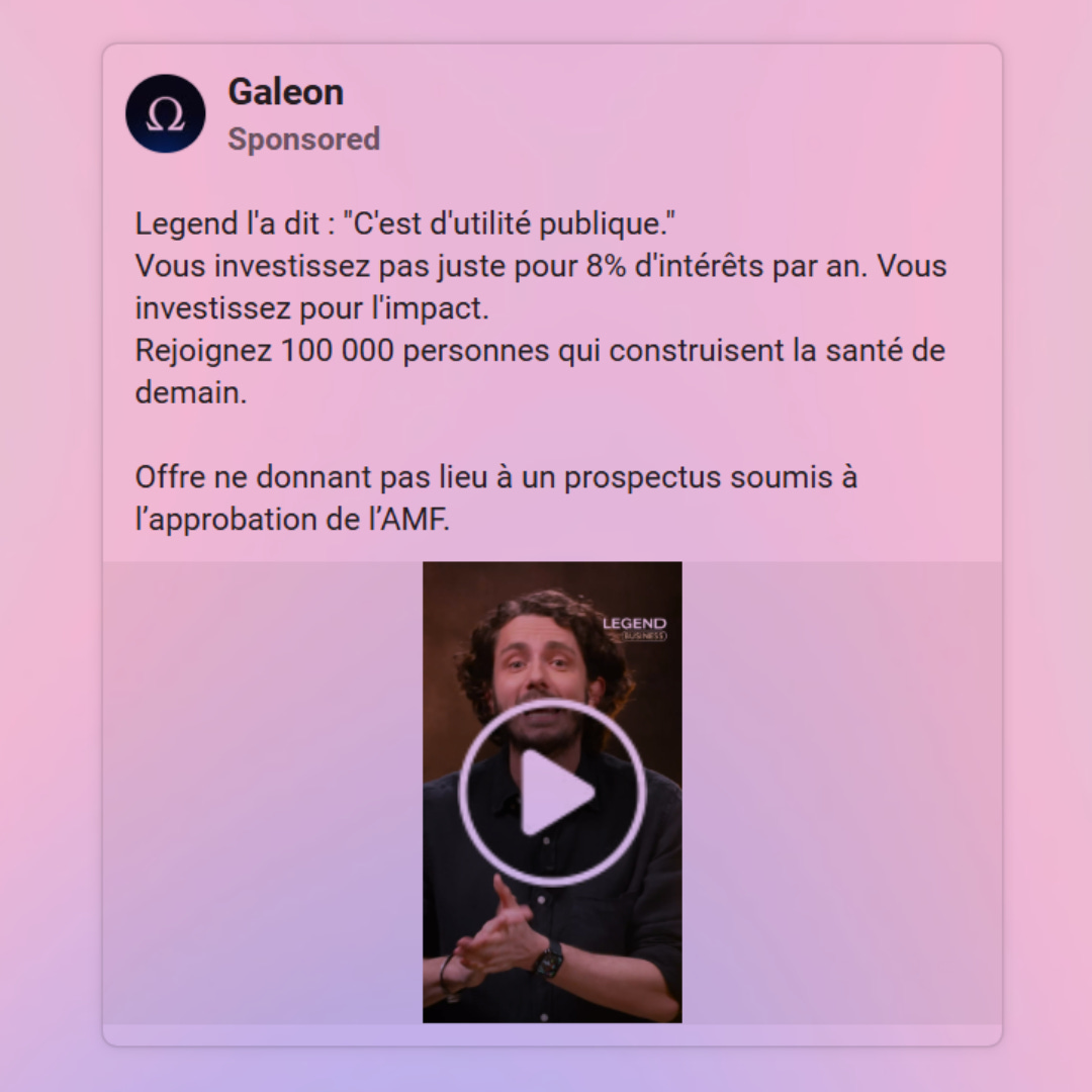 Début janvier, les pubs ont commencé à pleuvoir. Facebook, YouTube, LinkedIn, ma boîte mail. « 8% par an, 7 ans, la santé de demain. » Guillaume Pley en fait une heure et demie sur Legend. Matthias Baccino valide dans la foulée. Les publicités Facebook ne respectent à peu près aucune règle de l’AMF sur la communication financière. Et sur la plateforme de souscription, pas un mot sur les risques. Pas un.