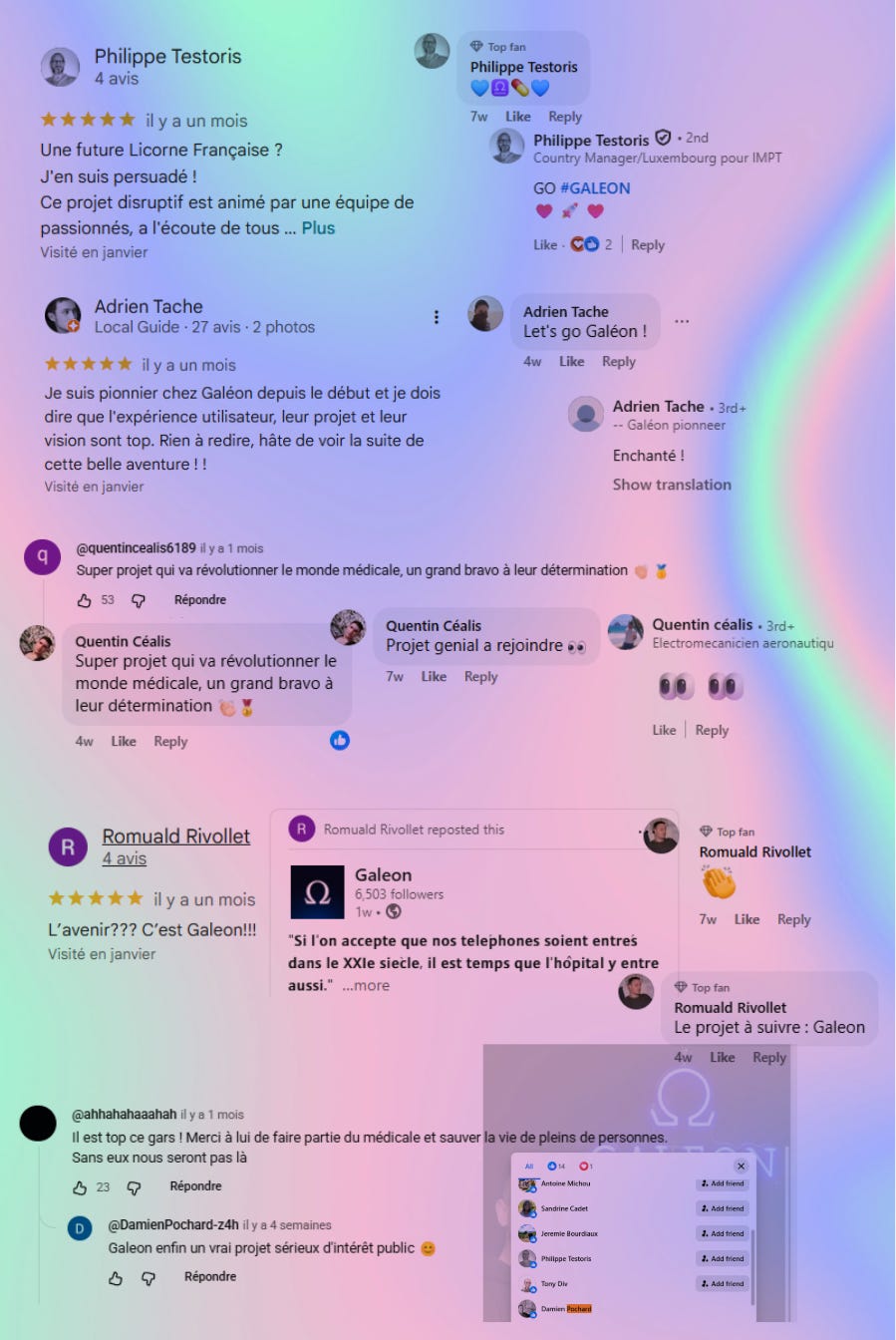 Même logique sur Google Maps. En janvier 2026, le mois de la publicité Legend et du lancement de la campagne obligataire, plusieurs dizaines d’avis 5* apparaissent sur la fiche Google de Galeon à Annecy. Près de la moitié n’ont aucun texte (juste « Visité en janvier » et 5*), déposés par des comptes souvent créés pour l’occasion. D’autres parlent d’« investissement », de « blockchain » et de « Pionniers ». L’un écrit : « aidez les pendant leur campagne des obligations ! ». Un autre met le ticker du token dans son avis : « $GALEON Révolutione vôtre quotidien à l’hôpital. ». La note résultante, 4,9/5, est ensuite affichée sur la page Atlantis comme argument de crédibilité pour vendre les obligations.