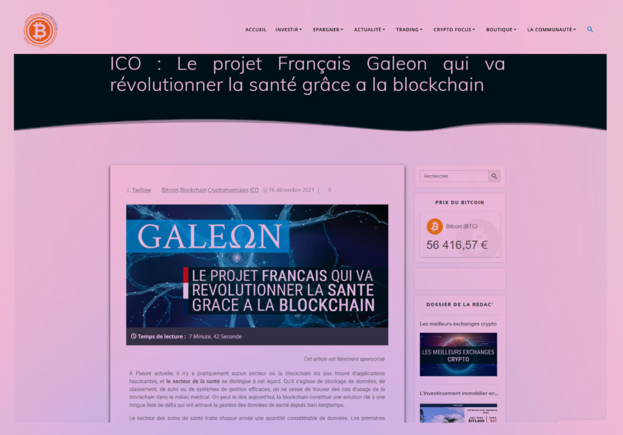 Galeon : La révolution de la santé grâce à la blockchain, Cointribune, 7 janvier 2022 – contenu crypto non-indépendant