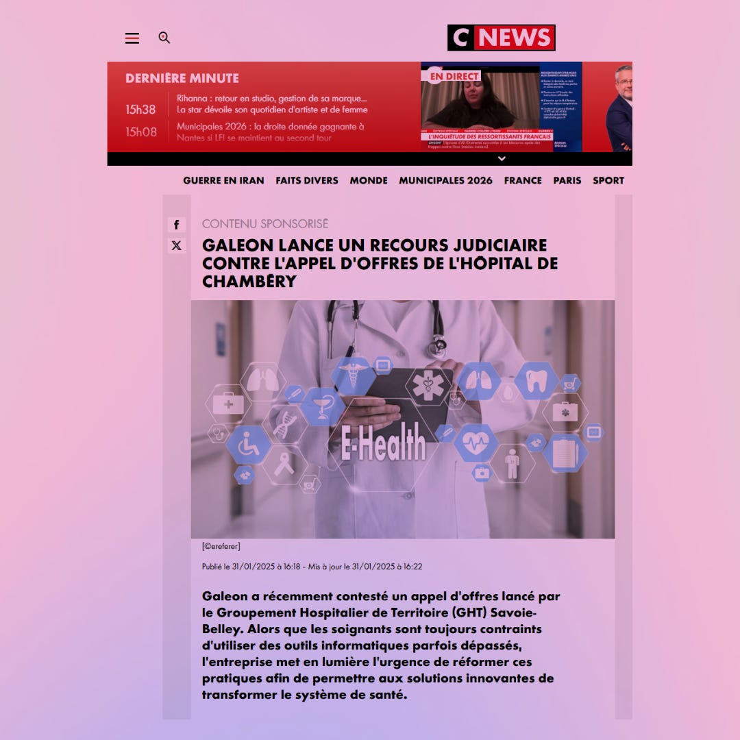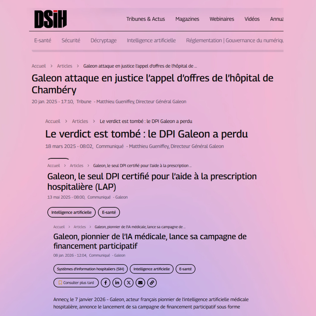 Le 20 janvier 2025, Galeon annonce contester l’appel d’offres en justice. L’annonce prend la forme d’un communiqué de presse rédigé par Matthieu Gueniffey, DG de Galeon, publié tel quel sur DSIH, le principal site d’information de l’informatique de santé. Ce n’est pas un article journalistique. C’est la parole de l’entreprise, présentée comme de l’information. Et qui fera de même en janvier lors du lancement du crowdfunding.