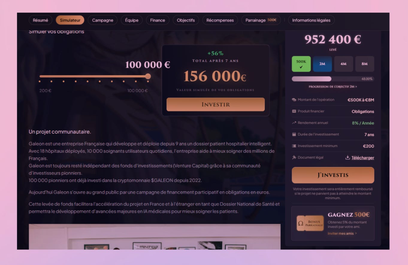 Sauf que la cathédrale se construit face à Softway Medical (150M€ de CA, 1’100 salariés) avec, selon ses propres chiffres, une cinquantaine de collaborateurs et un CA de 3,3M€ visé pour 202616. Galeon ne figure pas parmi les éditeurs référencés Ségur DPI Vague 1. Pour remporter des marchés GHT, il faut la taille. Pour avoir la taille, il faut des marchés GHT. Galeon a choisi une troisième voie pour sortir de l’impasse : financer sa croissance par de la dette émise auprès de particuliers.