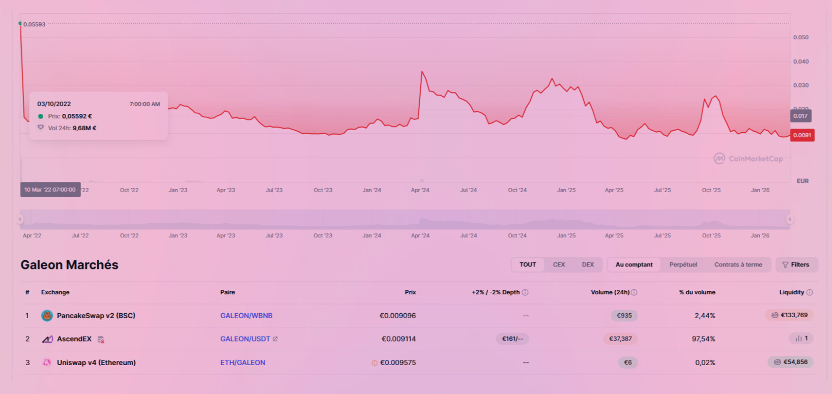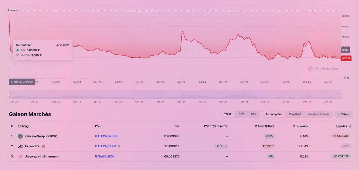 Quatre ans plus tard, le bilan est sans ambiguïté. Le $GALEON s’échange à ~0,00865 € en février 202631, soit une chute de 83,5 % depuis le listing du 10 mars 2022. Le haut historique (0,05255 €) et le bas historique (0,004776 €) datent tous les deux du premier jour de cotation : la volatilité a été extrême dès les premières heures, puis le token a entamé une longue descente. La capitalisation plafonne à ~7,13 M€, le volume quotidien réel ne dépasse pas ~1’500 dollars sur la paire la plus active (PancakeSwap), et les 17’630 holders n’ont pratiquement aucune porte de sortie. La fiche CoinGecko porte d’ailleurs un avertissement : le smart contract permet à son propriétaire de créer de nouveaux tokens sans limite32. Les évaluateurs tiers lui attribuent un score de 2,4/10 (Cyberscope33) et une note de confiance « faible » (Scamadviser34).