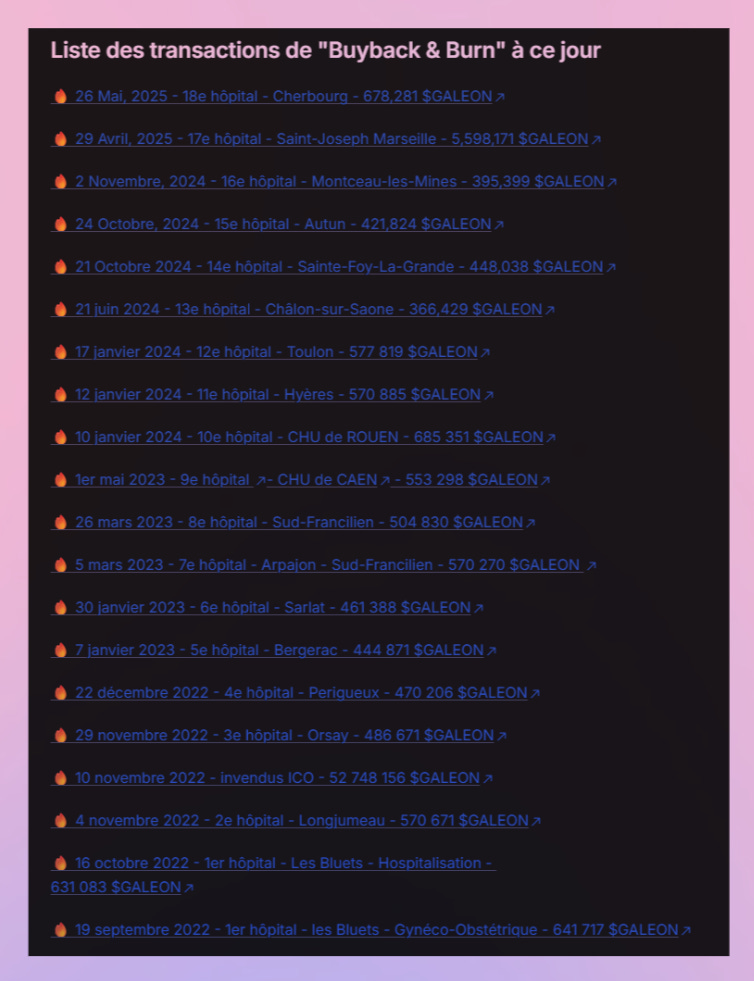 La promesse aux détenteurs de tokens, c’est : plus Galeon signe d’hôpitaux, plus le réseau de données grossit, plus le token a de la valeur. C’est séduisant. Sauf que rien ne relie concrètement les deux. Les hôpitaux achètent un DPI, pas du $GALEON. Ils ne participent pas à la blockchain. Le whitepaper mentionne un mécanisme de buyback & burn (la boîte rachèterait et détruirait des tokens à chaque signature d’hôpital). Le lightpaper revendique 67,8M tokens brûlés. Impressionnant, jusqu’à ce qu’on lise le détail : 52,7M sont des invendus de l’ICO détruits en novembre 2022, pas des rachats sur le marché. Les vrais buybacks liés aux hôpitaux représentent environ 15 millions de tokens.