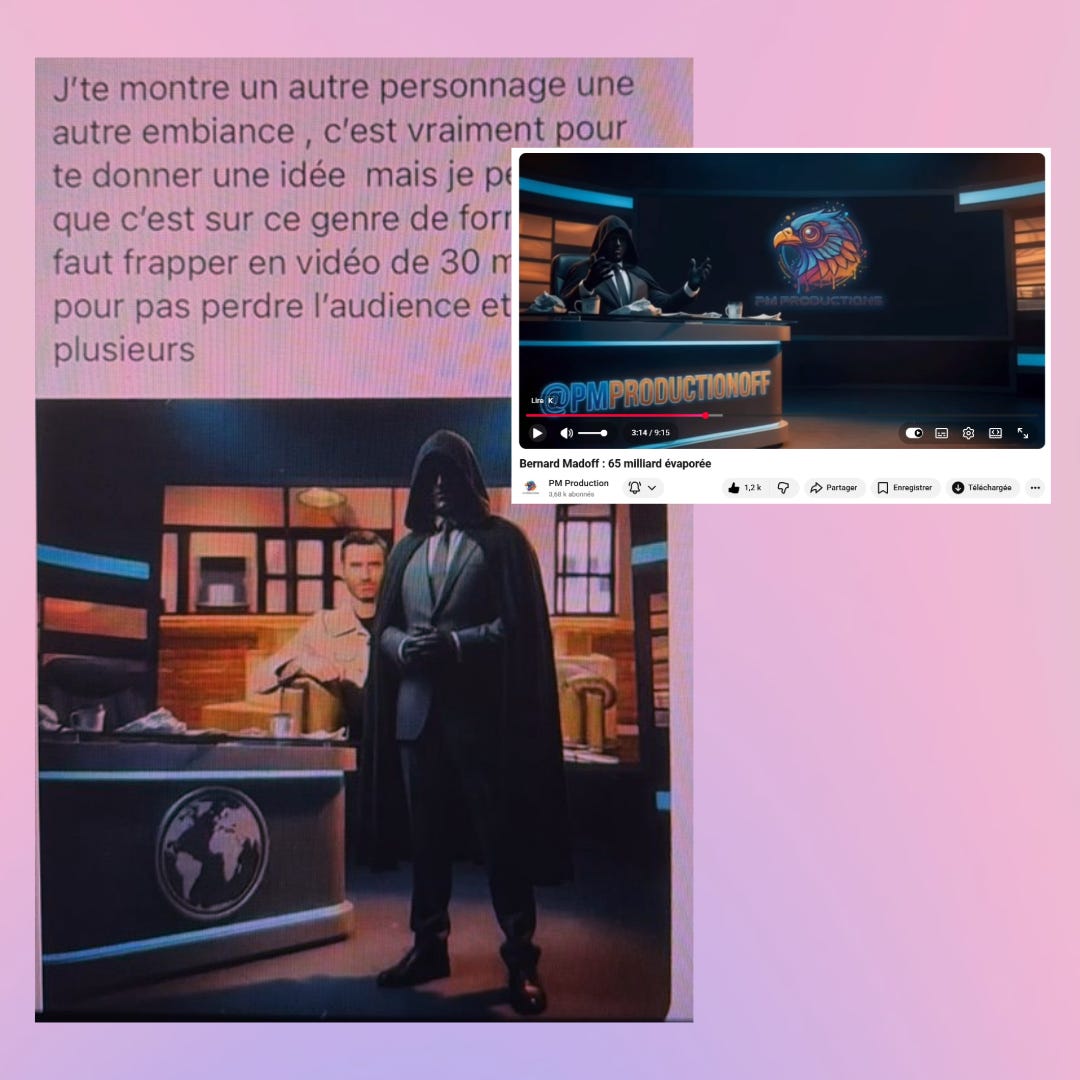 Il y a quelques jours, je reçois une énième vidéo dans mes notifications de veille. Une publication nulle sur YouTube : un personnage encapuchonné au visage noir, assis derrière un bureau, devant un logo d’aigle généré par IA et le nom « PM Productions ». Le tout doublé par une voix grave et menaçante, probablement humaine. Le genre de truc qu’on trouve entre deux vidéos sur les Illuminati.