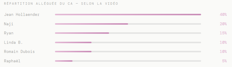 Rectification d'un des cités : les vrais pourcentages ne correspondent pas. Surtout, c'est lui qui les a fixés, par mail. Ce ne sont pas des parts d'un butin. Ce sont des commissions de prestataires, imposées par le patron. Un schéma classique chez les vendeurs de formations : les setters et les closers1 bossent à la comm, portent le risque, et si les résultats ne suivent pas, on ne leur doit rien.