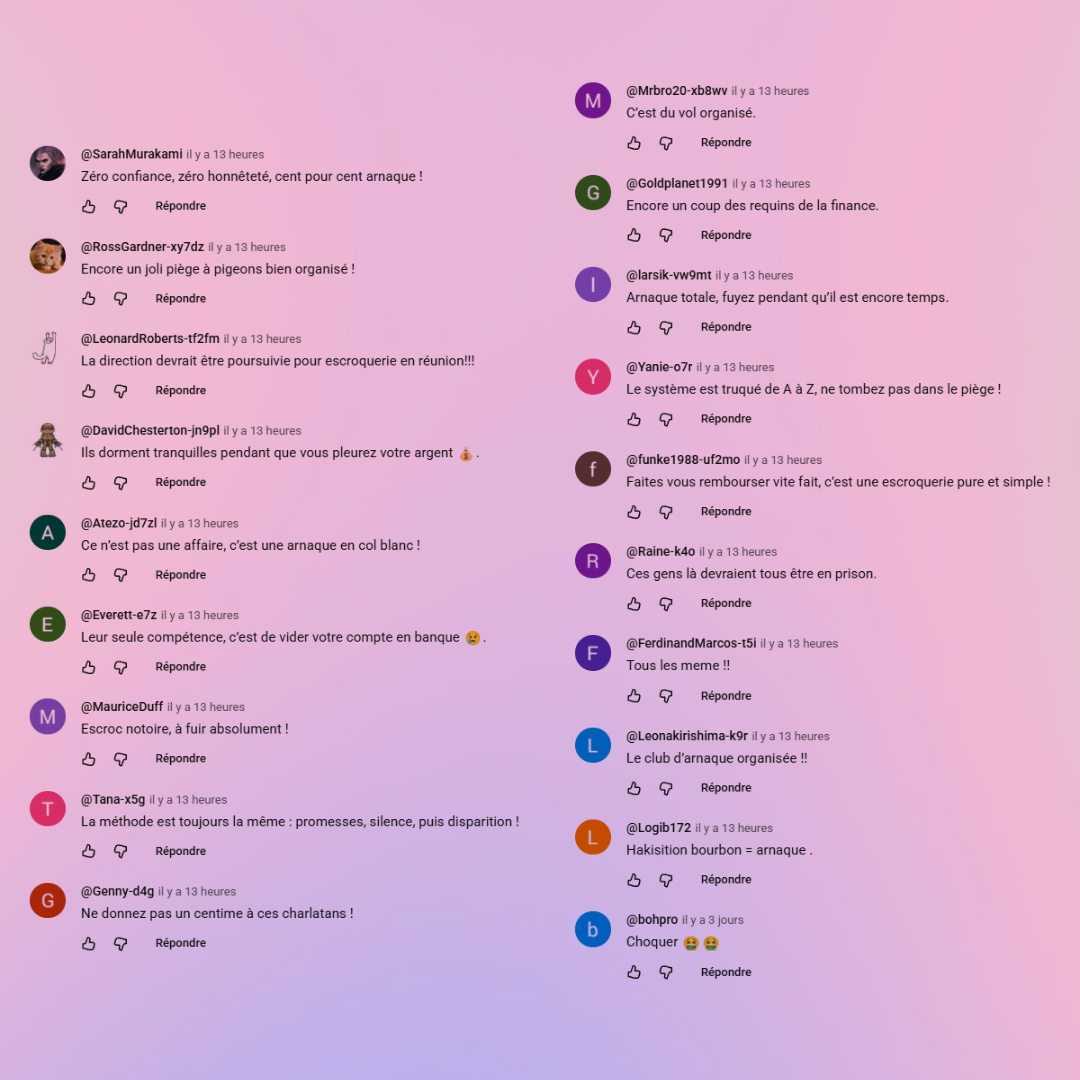 La justice est saisie à au moins 4 reprises, dont une fois via une plainte collective portée par le Collectif AVI2. Plusieurs dizaines de membres demandent des remboursements, parfois jusqu’à 14K€, sans succès. Pourtant, une poignée seraient encore prêts à mettre autour d’1M€ selon une source qui a quitté l’entourage de Benotmane récemment. À ce stade, c’est de la sélection naturelle.