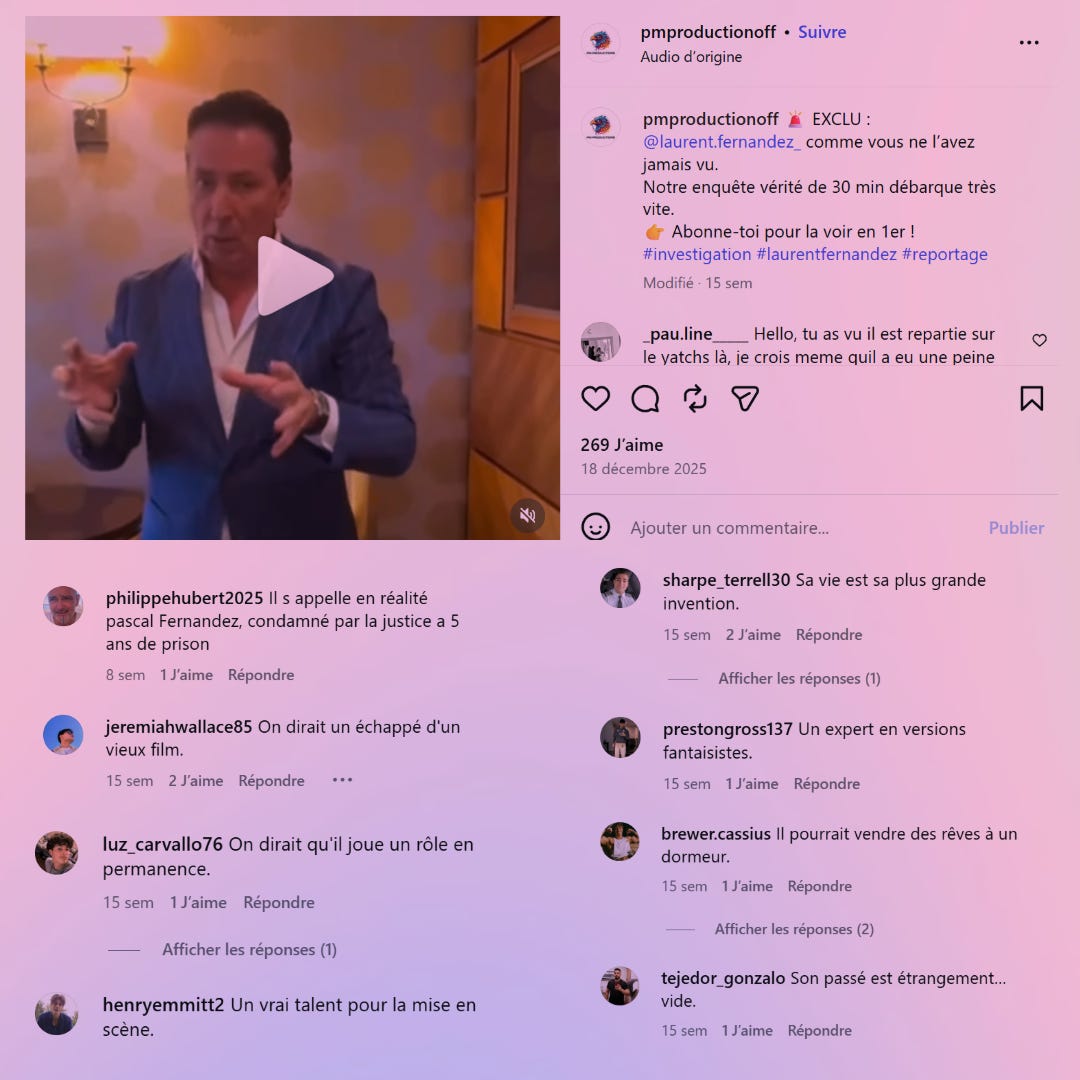 La publication Instagram de pmproductionoff sur Laurent Fernandez. 269 likes, des commentaires achetés, et un compte à 12K followers en quelques semaines.