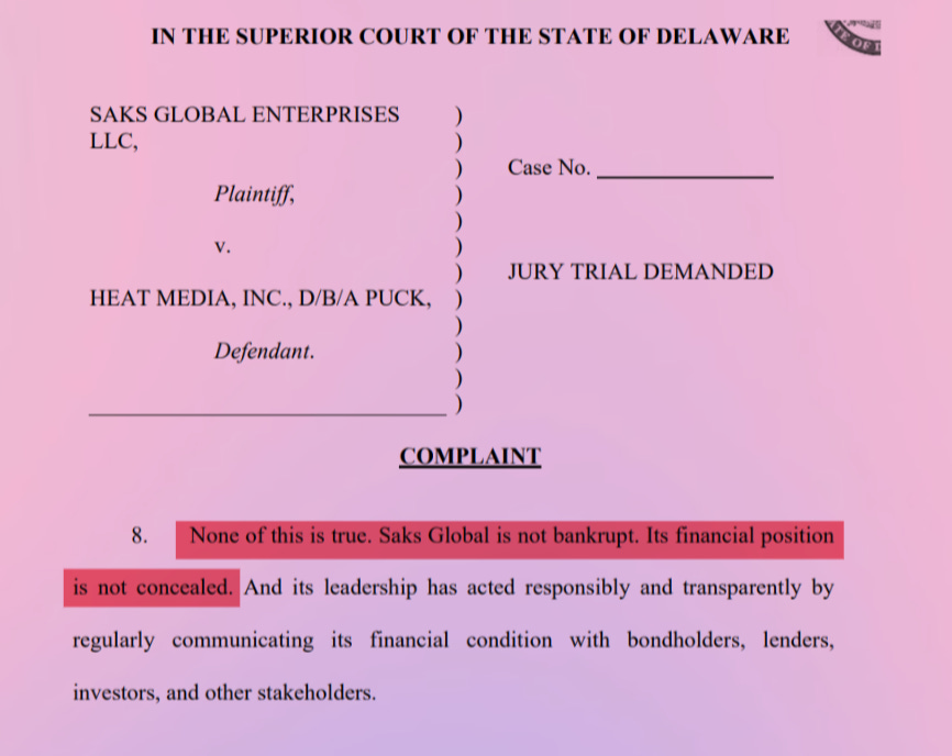 Saks Global Enterprises LLC v. Heat Media, Inc., d/b/a Puck, Superior Court of Delaware, Case No. N25C-10-070 MAH, déposée le 7 octobre 2025