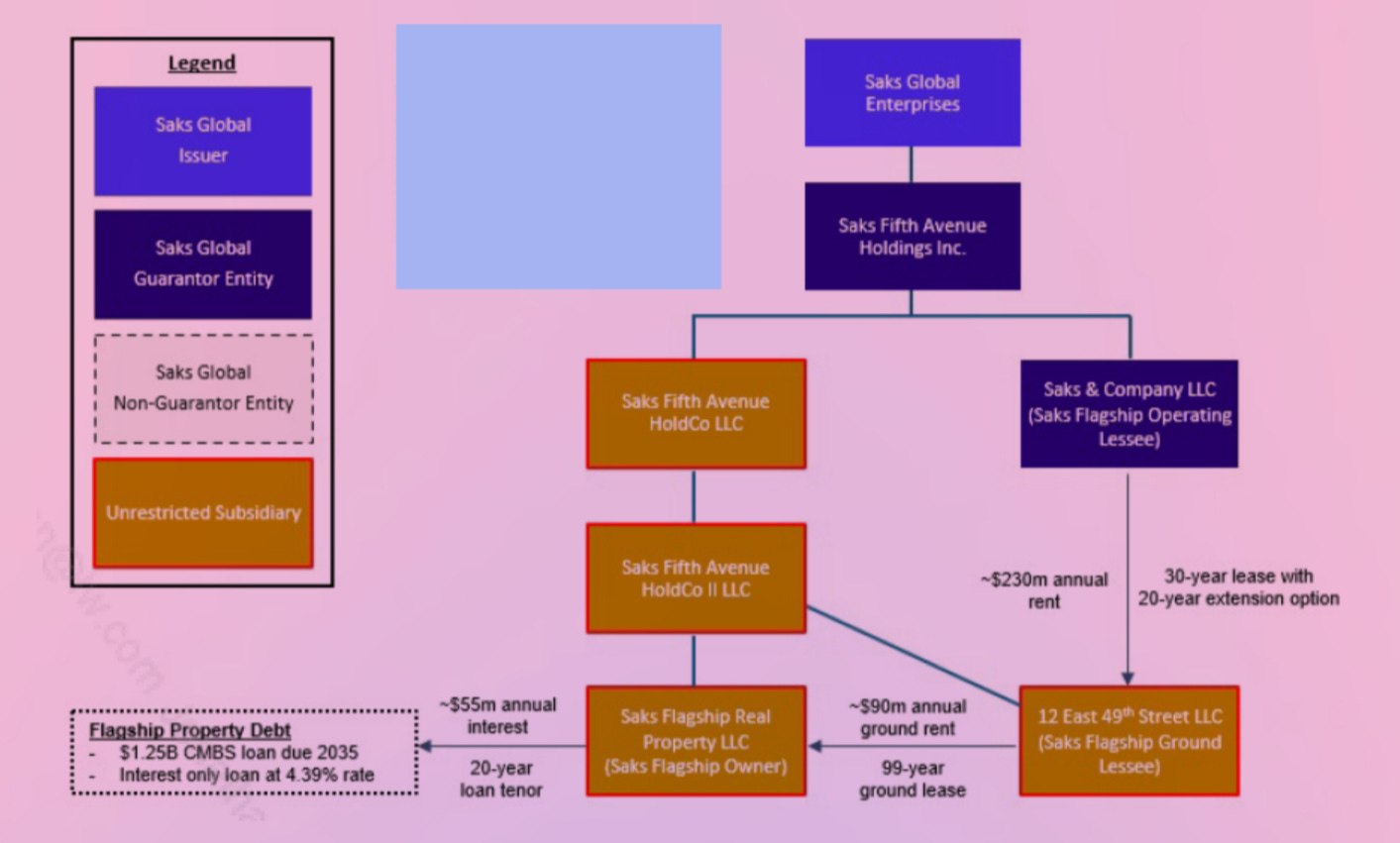 Une joint-venture avec Simon Property Group, le plus grand propriétaire de centres commerciaux des États-Unis, porte sur 31 propriétés. Saks détient 62,4% du capital. Chaque propriété est isolée dans un SPV séparé, adossé à un prêt CMBS16.17 L’immobilier est structuré pour être extrait, protégé, monétisé. Le retail, lui, peut couler.