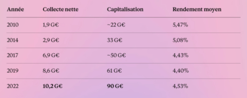 La collecte explose. 4 G€ en 2015. 5,5 G€ en 2017. 8,6 G€ en 2019, record historique. Et ça continue : 7,4 G€ en 2020 malgré le Covid, puis 7,4 G€ en 2021, puis 10,2 G€ en 2022, nouveau record absolu.