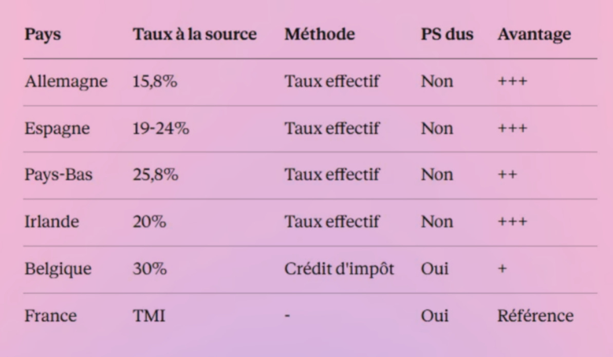 Les deux méthodes aboutissent exactement à la même imposition au centime près (dans les deux cas, pas d'impôt français direct mais intégration dans les revenus pour le calcul du taux effectif).