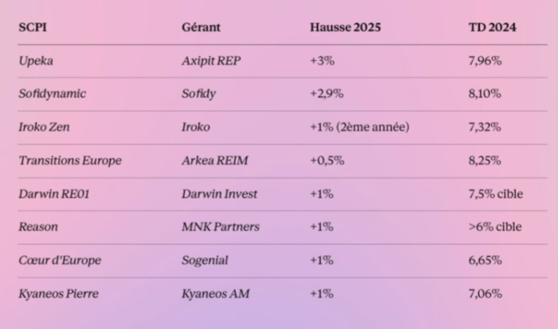 18 SCPI ont revalorisé leur prix de part à la hausse en 2025 (contre seulement 8 en 2024). Presque toutes des SCPI « nouvelle génération » :