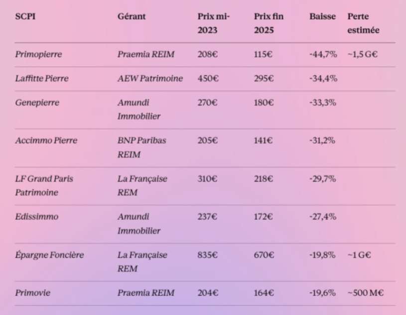 D’un côté, les SCPI historiques, lestées de bureaux franciliens achetés en haut de cycle entre 2018 et 2022. Gros immeubles, gros tickets, locataires uniques. Quand le marché se retourne, elles se retrouvent avec des actifs invendables et des valorisations en chute libre.