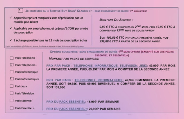 Pour quelques dizaines d’euros par mois, le client peut avoir un iPhone (dernier modèle) et parfois plus, le contrat ayant évoluant avec le temps.