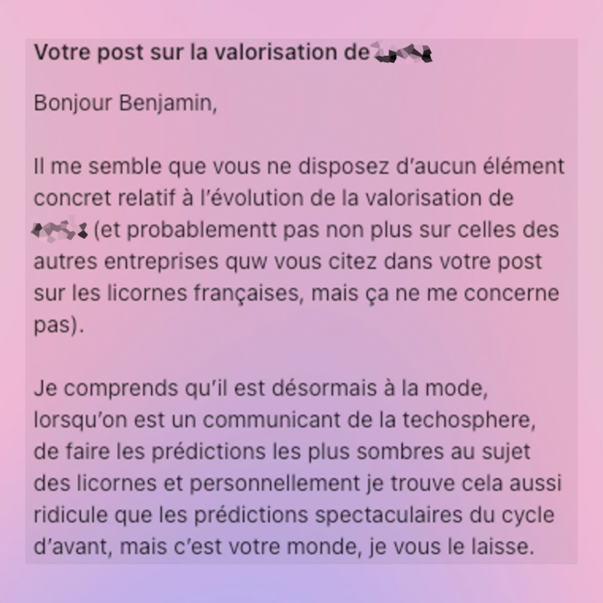 Ce statut n’est pas neutre. En juillet j’écrivais un article sur les licornes qui n’en seraient peut-être plus. Un patron de licorne m’écrivait le lendemain matin pour défendre la licornisation de sa boîte, dont les comptes n’ont jamais été publiés.