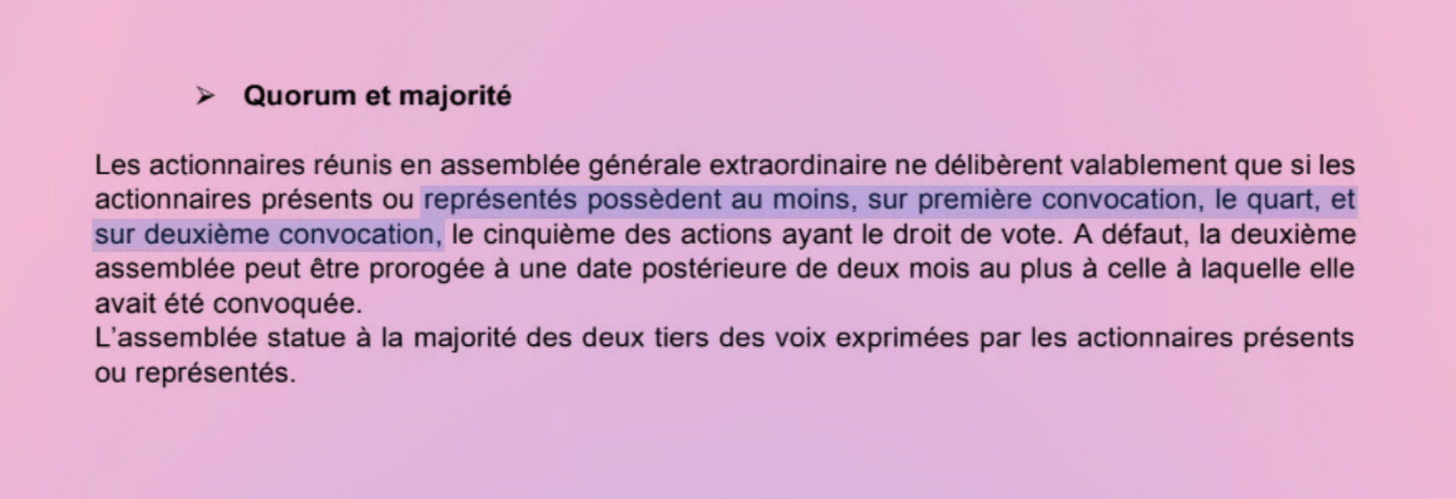 EDIT 31/03/25 à 12H50 : l’AG du 21 décembre était une AG ordinaire. Dans ce cadre, les décisions exigent un qorum de 20% des droits de votes. Il était donc atteint, avec 24,6%.