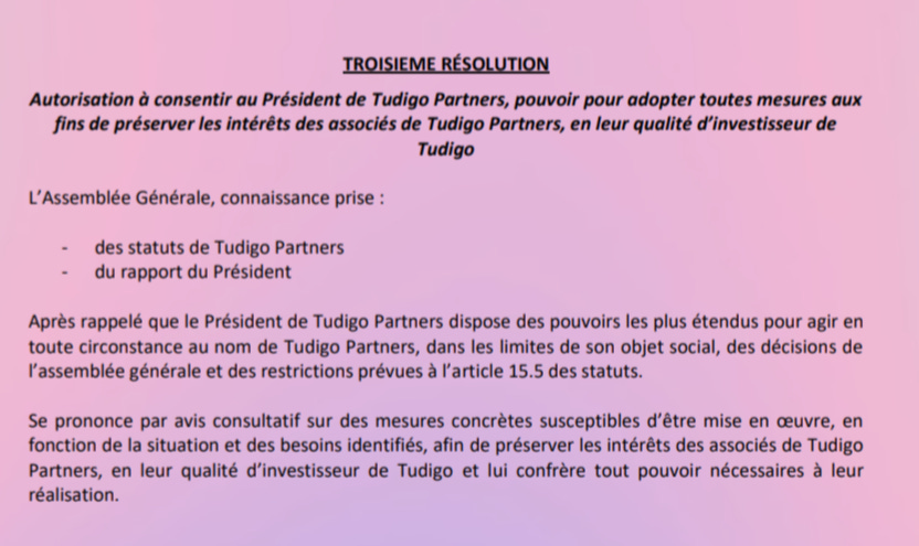 « Il est expressément rappelé, dans le texte même de la résolution, que le Président de Tudigo Partners dispose déjà, en vertu de l’article 15.5 des statuts, des pouvoirs les plus étendus pour agir en toute circonstance au nom de la société, dans les limites de l’objet social et des décisions de l’assemblée générale. Cette résolution n’ajoute donc aucun pouvoir nouveau.