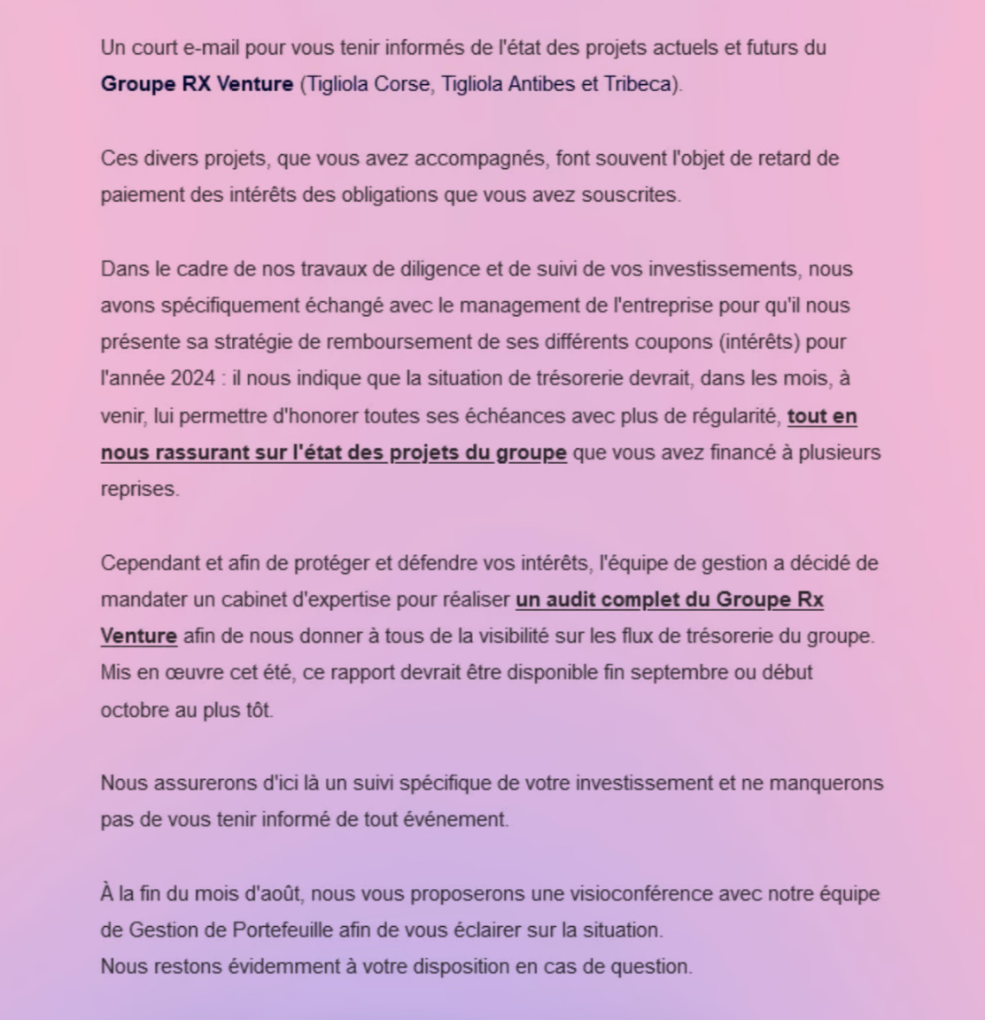 « Le plus important c’est de sauvegarder les 200M€ investis par nos 41000 investisseurs. Cela passe par la reprise en main du portefeuille et sa sécurisation, par l’installation d’une nouvelle gouvernance afin de retrouver l’apaisement, puis par la poursuite du projet d’entreprise commencé l’été dernier. »